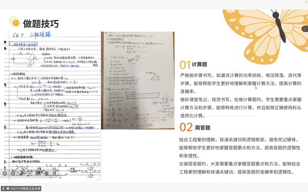 何敏喆针对发电厂发电主系统课程内容杂、记忆点多等学习痛点,提出首先要梳理框架,把课程按题型分为计算和画图两部分,或者按内容分为发电厂类型、电气设备分类、接线画法等大板块,便于自己归纳整理;廖洁同样就发电厂课程内容,具体到每个核心知识点做了进一步分析,并配上详细例题为同学们讲解思路与易错点,强调了学习方法从理论到实践的转变;周悦则以电力系统分析课程为中心,从定位出发,说明电力系统分析是国网考试、考研重要科目,不仅为同学们梳理了核心知识,还强调了要有良好的时间心态管理,同时就课程考试如何备考提出了自己的建议。