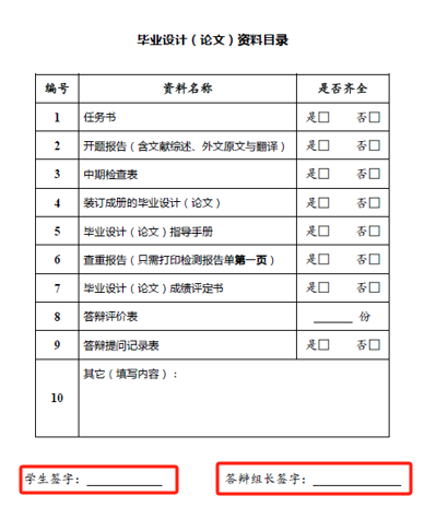3. 答辩组负责“资料目录”中的8~9项,检查所有信息和签字处是否都齐全,答辩结束装回各自资料袋中。