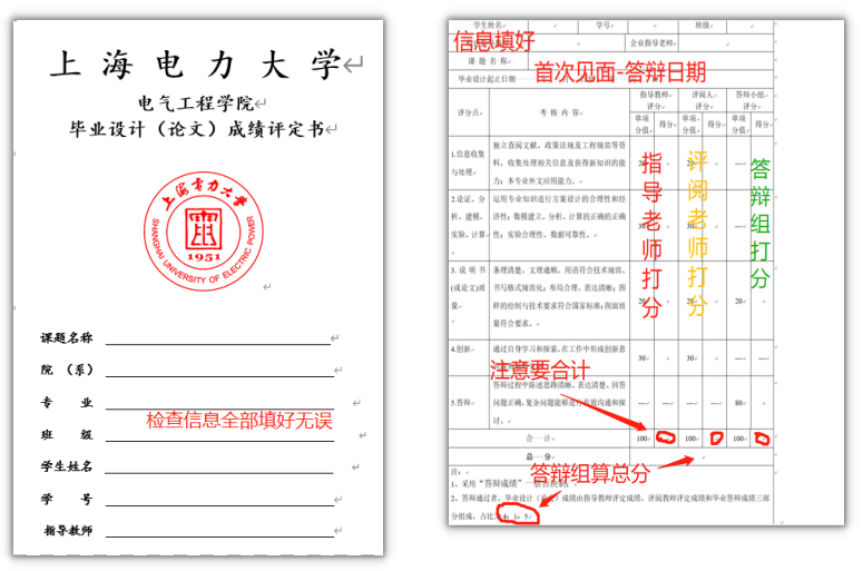 2. 第7项成绩评定表,答辩结束不要装回资料袋,填好成绩写好评语签好字后,由答辩组收齐单独上交,要求在5月23日前交到致远楼905室。