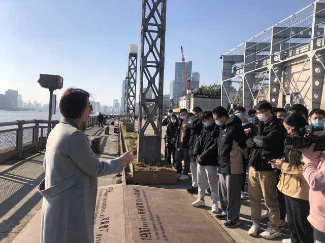 焦娅敏教授邀请了杨浦党校周煜老师为参与活动的师生进行现场讲解。周老师围绕杨浦滨江近代以来的历史,以及近年来的发展规划情况沿途进行介绍,她说:“这里不仅是杨浦滨江的起点,还是我们共产党红色启航的地方。”周老师对着秦皇岛路码头的壁画向大家详细介绍了上世纪以周恩来、邓小平、蔡和森等为代表的革命先驱从这里乘船出发赴法国勤工俭学,学习当时世界上的先进理念的故事。大家一边沿着江边行走,许多地标建筑还留有老上海工厂的印记,一边听着讲解,知道了在革命年代,上海的工人们曾在这里开展了一次次风起云涌的工人运动,对于杨浦滨江的红色文化有了更加全面立体的认识。