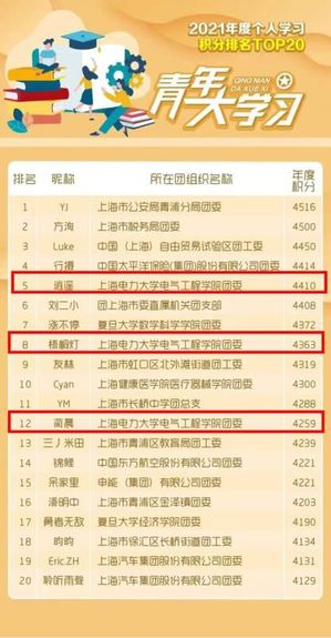 近日,公司3044永利集团学子武旭文、毛迪、廖梦竹三名同学分别以4410分、4363分、4259分荣登上海2021年度“青年大学习”个人学习积分榜TOP20。