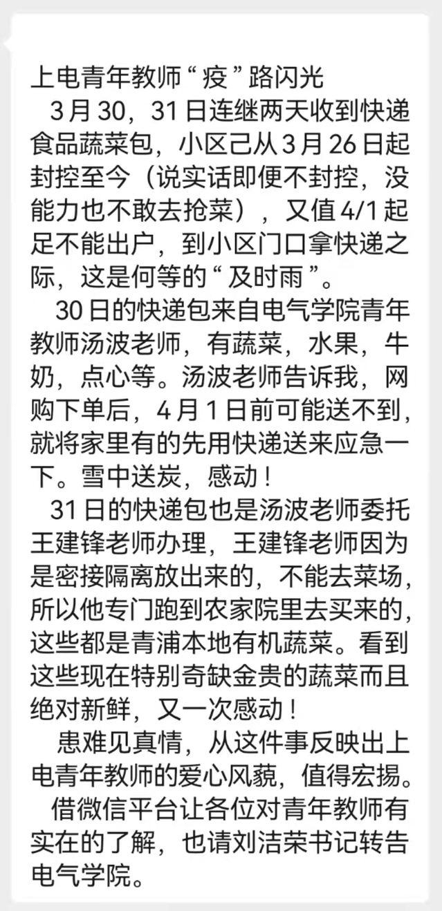近日,一封名为《上电青年教师“疫”路闪光》的感谢信,通过微信的方式发送到公司退管办干部的手机上。写信者为公司3044永利集团退休教师屠志健,他感谢的对象,是该公司青年教师汤波。