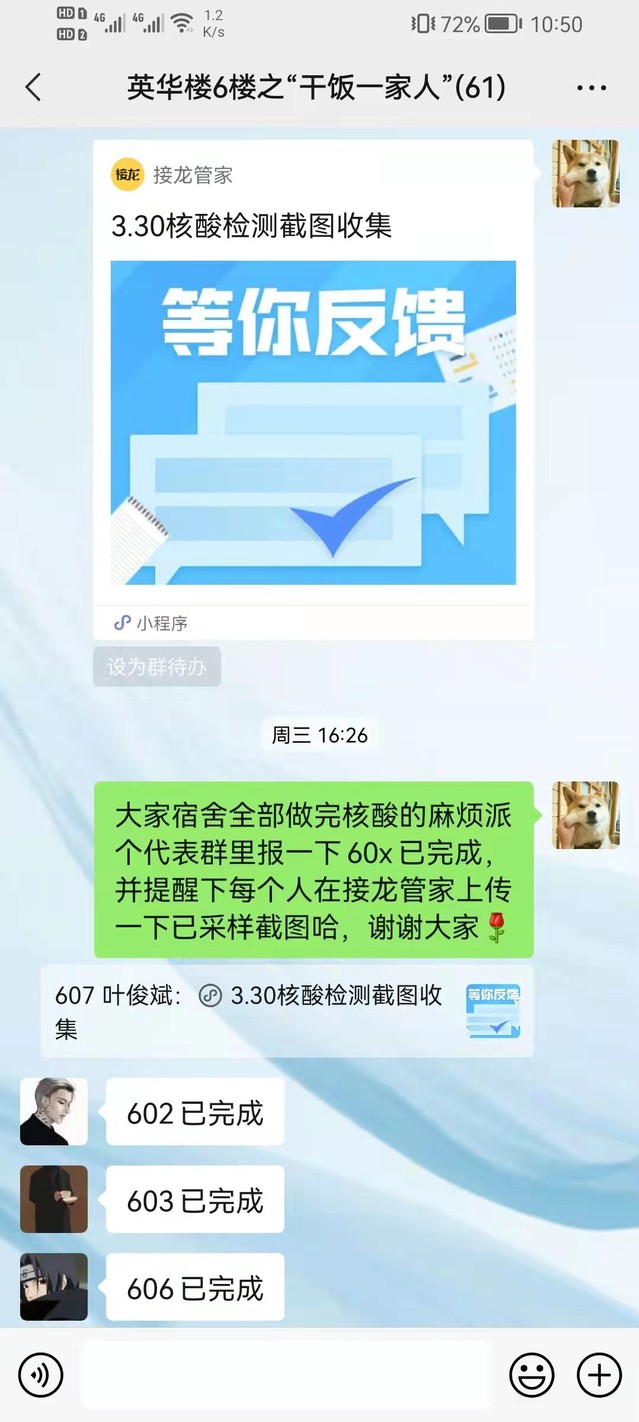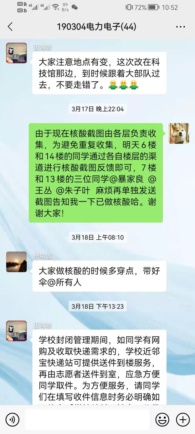 3月14日晚8点整,公司杨浦校区正式启动校园封闭措施,全员进入“7+7”健康管理阶段。在辅导员王海思老师的统一指导和部署下,叶俊斌同志被紧急任命为英华楼6层负责人,原作为班级团支书的他在确认好班级同学均已回到寝室后立即转变工作角色,第一时间前往英华楼6层各寝室进行情况通报,组建楼层沟通平台、建立师生沟通渠道,同时迅速投入工作状态,通过“线上+线下”联动的方式连夜组织楼层参加核酸检测。