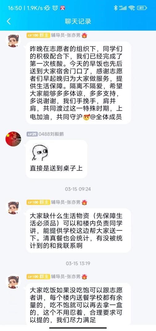 3月14日晚8点整,公司杨浦校区正式启动校园封闭措施,几乎是第一时间,张亦男老师在年级群里安抚同学们情绪,同时组织同学有序进行核酸检测,此时的她人在校外,心在校内,在服从公司安排、忙碌工作的同时密切关注着同学们的状况,不断在群里和大家交流问题并寻求解决途径。