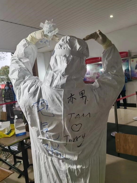 当被问及第一次做“大白”有什么感受时,她这样说:“刚接到采样任务的时候有点紧张也有点兴奋,会担心做的不好,担心数据核准出错,但是穿上防护服坐在那里的那一刻,有一种使命在肩的感觉,立即心无杂念的投入到了采样工作里去。整个采样过程紧张有序,采样队伍一组接着一组,没有停歇的机会,也丝毫不敢懈怠,渐渐的这种兴奋感消失带来的是机械操作的疲劳感。但是同学们的积极配合和每次离开时的“谢谢”都会让我力量倍增,最终在三个小时完成了650人次的采样工作。从被检测到做检测,真切的感受到了“大白”工作的辛苦与不易,这些采样量不足他们一天完成量的1/3,所以请把更多的理解、支持和感谢都送给他们,让我们一起努力,共同守“沪”。”