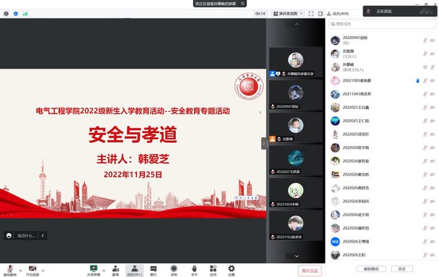2022年11月25日,公司举办了2022级新生入学教育安全专题线上讲座“安全与孝道”,活动特邀国网河南省电力公司经济技术研究院教授级高工韩爱芝老师主讲,公司党委书记赵玲、2022级新生辅导员、全体2022级新生参加了本次讲座活动,讲座由公司2022级新生辅导员罗黛主持。