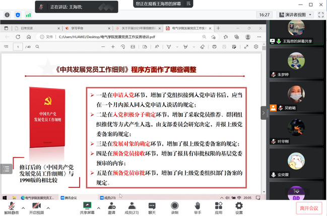 会议伊始,公司党委组织员王海思就《中共发展的党员工作细则》等内容进行专题分享,就今年公司党员发展工作中的重点、难点问题进行交流和总结,要求各党支部要在党员培养考察教育的各个环节进一步从严要求,并做好日常管理和记录整理工作。