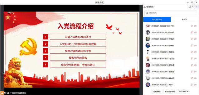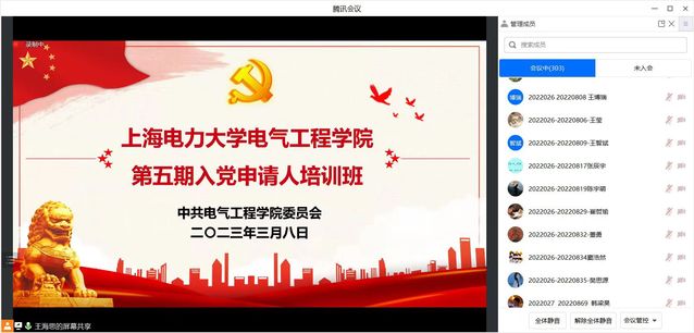3月8日,公司第五期入党申请人培训班在腾讯会议线上召开。公司党委副书记叶华刚、公司专职组织员吴晗璐、王海思出席了本次会议,公司第五期入党申请人培训班全体成员参会。