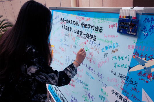 5月25日当天开始展板留言活动,临港校区和杨浦校区的同学们纷纷来留言,同学们将内心的想法用五彩缤纷的彩笔体现出来,写下形态不一、个性十足的留言。