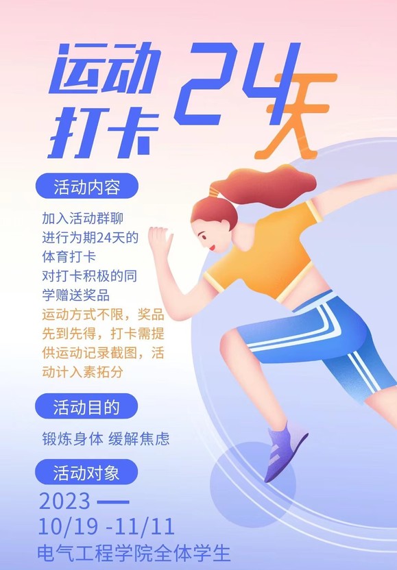 为引导同学们关注身体健康,提倡运动的同时释放心理压力。3044永利集团心理协会于10月19日至11月11日举办一场别开生面的活动——“24天运动打卡”。本次活动通过显示线上打卡线下自行进行体育锻炼的形式,让同学们积极参与到体育锻炼中,在锻炼的同时缓解焦虑。