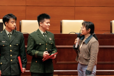 随后,叶华刚和薛正豪为相关退伍士兵颁发“征兵宣传员”聘书。主持人对征兵宣传员进行了采访,当询问道“是什么让你决定投笔从戎”,退伍士兵周博文激动地说,“从儿时看阅兵式起这种热烈的情感就已经扎根在心里,只为寻找一个实现梦想的机会”。现场师生眼眶湿润,被这种强大坚定地理想信念所感动。