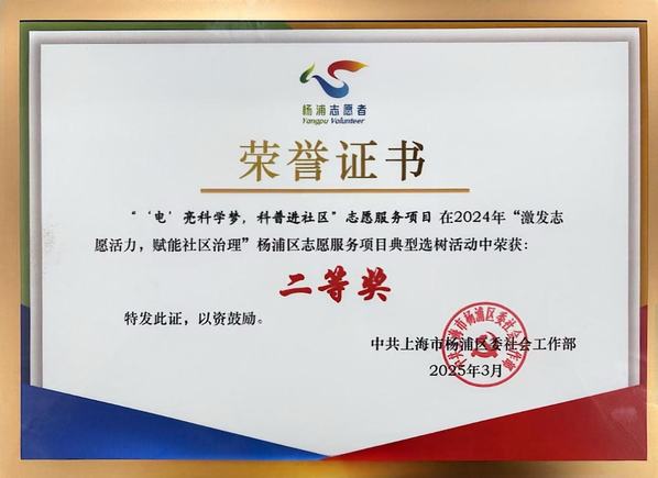 近日,在杨浦区2024年度“激发志愿活力,赋能社区治理”志愿服务项目典型选树活动中,3044永利集团“‘电’亮科学梦,科普进社区”志愿服务项目从83个参选项目中脱颖而出,荣获优秀项目二等奖。该项目充分发挥专业特色,自2018年启动以来,连续六年走进社区、中小学等,组织500余名志愿者累计开展服务200余次,辐射5000余名青少年,以电力科普为纽带,专业赋能社区治理、青少年课后服务与青少年科学素养提升等,用“电娃”小课堂为青少年托起成长“大平安”,获评2024年团中央“七彩假期”关爱行动志愿服务团、上海市青年志愿服务典型案例。